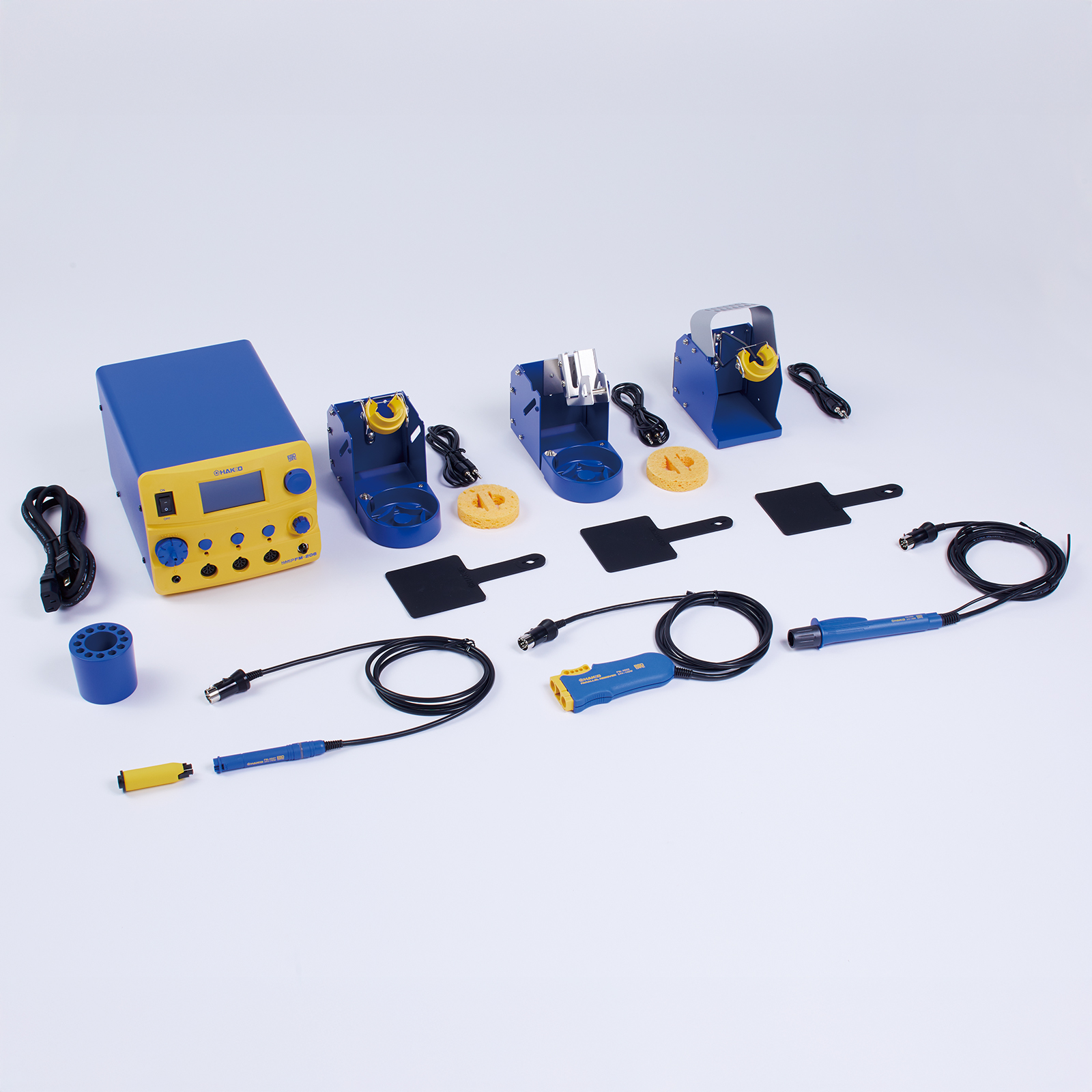 - ●本体 ●電源コード ●FM-2027 コンバージョンキット ●FM-2022 コンバージョンキット ●FM-2029 コンバージョンキット ●こて先置き台 ● 取扱説明書 ● 登録書(3年保証)※こて先は別売です。別途、ご希望のこて先をお買い求めください。